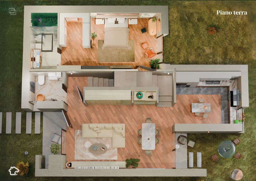 Il piano terra ospita soggiorno ampio, cucina con isola e zona pranzo separata. Spazi aperti e accoglienti, ideali per ogni momento della giornata.